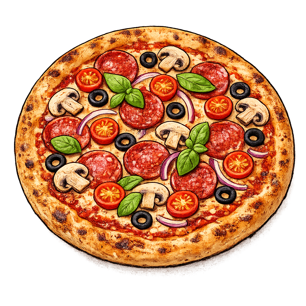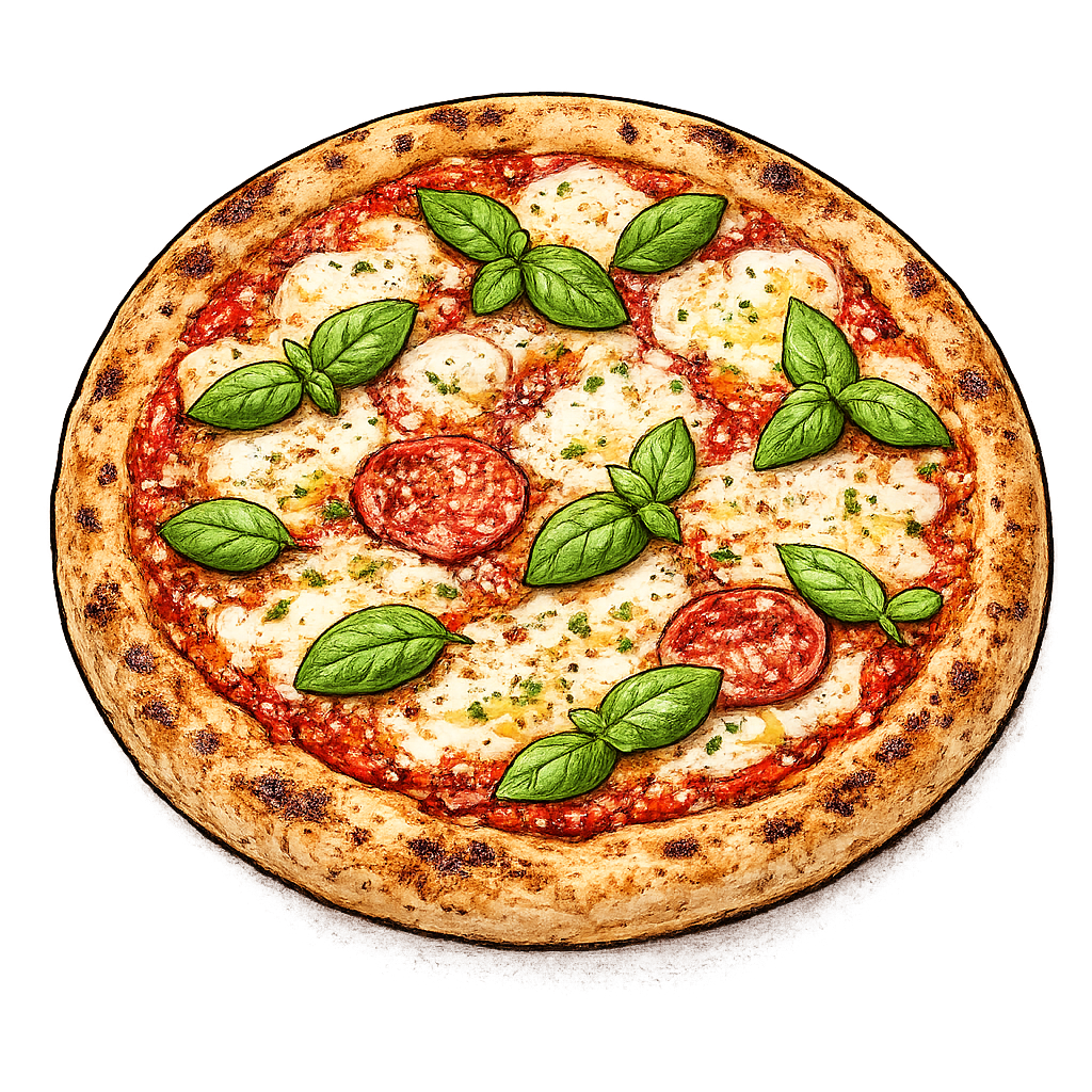 Alla pizzor bakas på vår egen deg, toppas med noggrant utvalda råvaror och gräddas i stenugn direkt vid beställning.